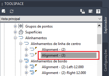 O mesmo alinhamento é automaticamente exibido e selecionado sob a coleção Alinhamentos Alinhamentos da linha de centro na árvore Prospector. Utilize este comando para localizar rapidamente a localização do alinhamento de intersecção na árvore Prospector.
