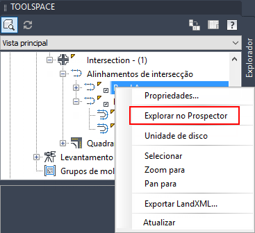 Para usar este comando, clique com o botão direito do mouse em um alinhamento na coleção Alinhamentos de intersecção e selecione Explorar no Prospector.