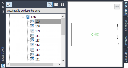 Quando o Toolspace estiver encaixado, a vista de lista é exibida abaixo os dados de árvore. Quando o Toolspace está desencaixado, é possível exibir a vista do item abaixo da árvore de dados ou para um lado dos dados da árvore, ao clicar no botão orientação de vista de item.