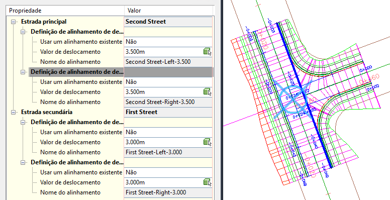 Realce do objeto no desenho: quando você seleciona alguns itens em uma caixa de diálogo de edição de intersecção, o objeto afetado é realçada no desenho. Por exemplo, quando você seleciona um deslocamento na caixa de diálogo Parâmetros de deslocamento de intersecção, o alinhamento do deslocamento é realçado no desenho. Este comportamento é exibido na ilustração a seguir.