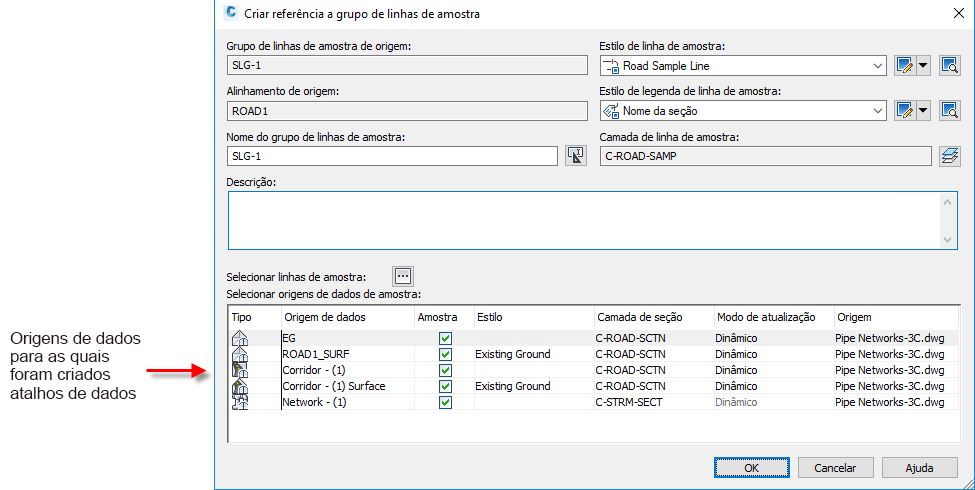 As caixas de diálogo individuais para a criação de referências de atalhos aos dados não serão exibidas durante esse processo. Se desejar especificar os ajustes padrão utilizados na criação das referências antes de usar o comando Criar referência a grupo de linhas de amostra, use as configurações de comando aplicáveis, como CreateSurfaceReference, CreateProfileReference, CreateNetworkReference e CreateCorridorReference.