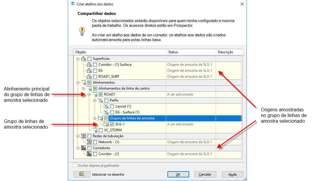 Quando você criar um atalho aos dados para um grupo de linhas de amostra, serão exibidas notas na coluna Status da caixa de diálogo Criar atalhos aos dados para informar que itens do desenho são origens amostradas do grupo de linhas de amostra.