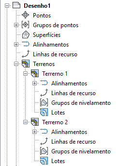 Cada coleção de topologia de terreno contém coleções para alinhamentos, nivelamentos e lotes: