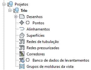 Um projeto contém coleções de objetos de projeto, tais como superfícies, alinhamentos, perfis, redes de tubulação, redes de pressão, e grupos de moldura da vista, que podem ser compartilhados com outros projetos. Todos os objetos de projeto compartilhados são listados nas coleções de objeto de projeto na árvore do Prospector. Os membros do projeto podem criar uma cópia somente para leitura de um objeto de projeto, intitulando-areferência, em um desenho. Esta cópia somente para leitura da geometria de objeto do projeto pode ser utilizada para executar legendas, projeto, análise ou tarefas hipotéticas.