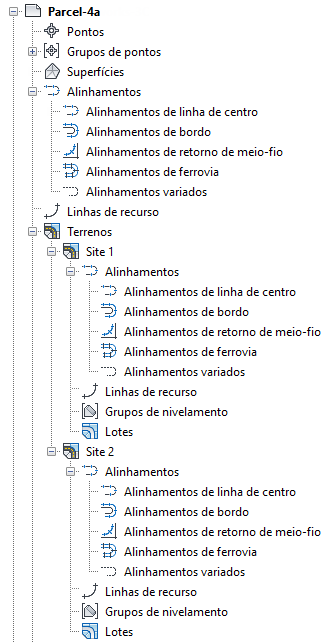 - A coleção Alinhamento dentro de uma coleção de topologia ou terreno. Quando colocados aqui, os alinhamentos interagem com outros alinhamentos e lotes no terreno. Se você quiser que os alinhamentos formem lotes por regiões fechadas, mas não subdividam os lotes existentes, atribua os alinhamentos e lotes a terrenos diferentes.