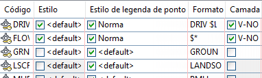 O que se segue são amostras de chave de descrição, mostrando código, estilo de ponto, estilo de legenda de ponto, formato, e propriedades de camada: