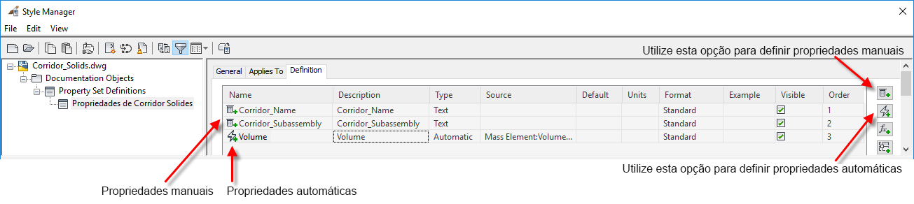 Crie um novo conjunto de propriedades e configure propriedades manuais e automáticas para associar com os objetos.