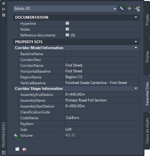 Por padrão, o Autodesk Civil 3D inclui três definições de conjuntos de propriedades que se aplicam aos corredores, sólidos e corpos 3D: