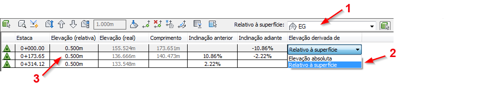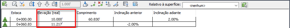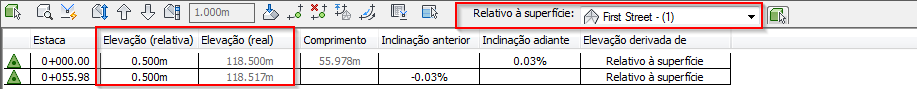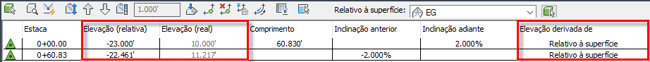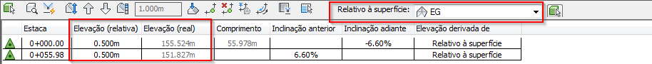 Se for alterado para ser relativo à superfície EG, a elevação real permanece a mesma e a coluna Elevação (relativa) mostra a diferença de elevação entre a linha de recurso e a superfície.