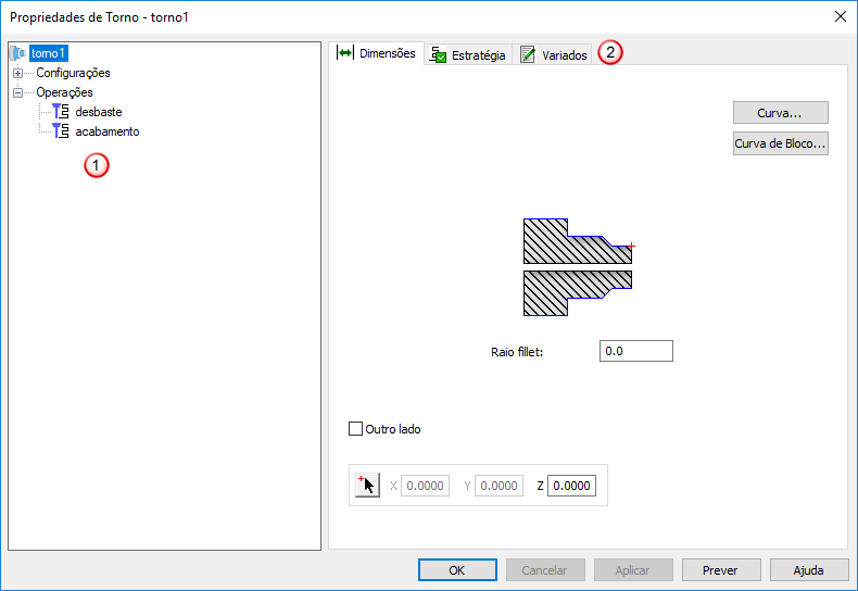 O diagrama da guia de figura de torneamento lista as diferentes operações para a figura: