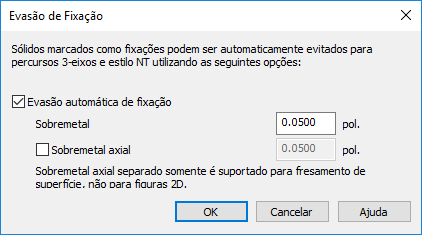 Evasão automática de fixação — Selecione essa opção para automaticamente evitar sólidos marcados como fixação. Para marcar um sólido como fixação, clique com o botão direito no seu nome na Vista da Peça e selecione Usar Sólidos Como Fixação no menu de contexto.
