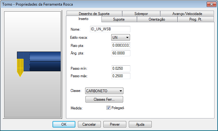 Medida — Indica as unidades utilizadas para reportar as dimensões da ferramenta. Selecione Polegadas para unidades em polegadas ou desfaça a seleção para unidades em milímetros.