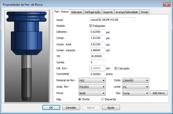 TPI/Passo — Para ferramentas imperiais, você especifica os fios de rosca por polegada (TPI/POL), e para ferramentas métricas o Passo das roscas.
