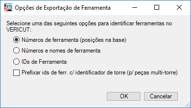 Utilize o diálogo Opções de Exportação de Ferramenta para especificar as opções para identificação de ferramentas no VERICUT.