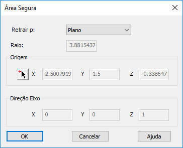 Cilindro — Se você selecionar Cilindro, a área segura da operação é configurada como um cilindro infinitamente longo. Insira o Raio do cilindro, a Origem e a Direção do Eixo.