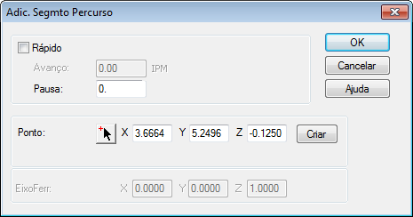 Esse diálogo permite inserir um novo ponto antes do ponto atualmente selecionado. Para cada ponto que você deseja criar, insira as novas coordenadas do Ponto, especifique um Avanço ou selecione a opção Rápido; opcionalmente, insira uma Pausa em segundos, e clique no botão Criar. Quando tiver concluído a criação de pontos, clique em OK.