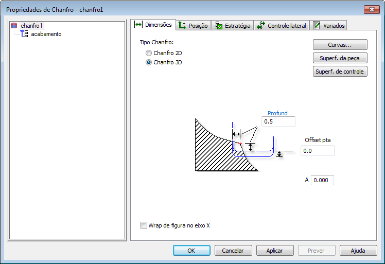 Insira a Profundidade do chanfro 3D, que é um offset horizontal e vertical (negativo) da ferramenta a partir do ponto de contato na curva de entrada (o padrão é 0.020" ou 0.5 mm).