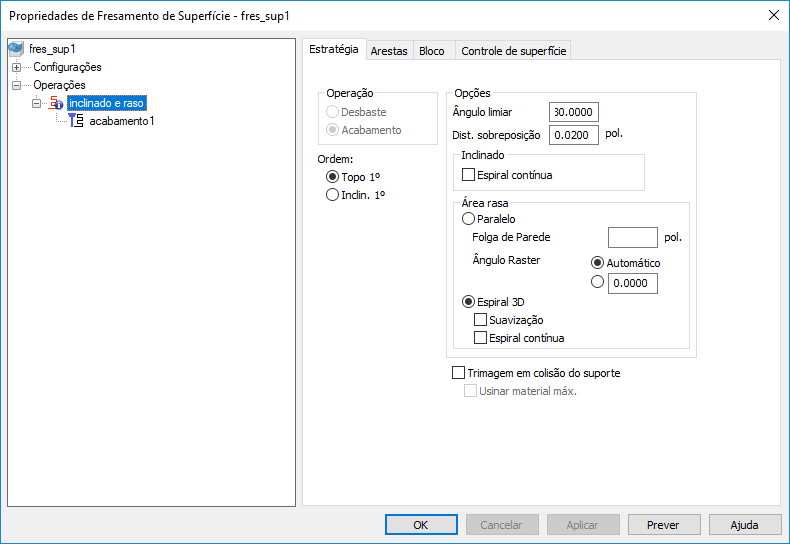 Ângulo limiar — Insira o ângulo de inclinação da superfície, medido a partir da horizontal, que determina a divisão entre usinagem Z constante (inclinada) e rasa.