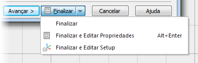 Finalizar e Editar Setup — Aceitar as configurações padrão nas páginas restantes, fechar o assistente e exibir o diálogo Propriedades de Setup, que permite editar o Setup atual.