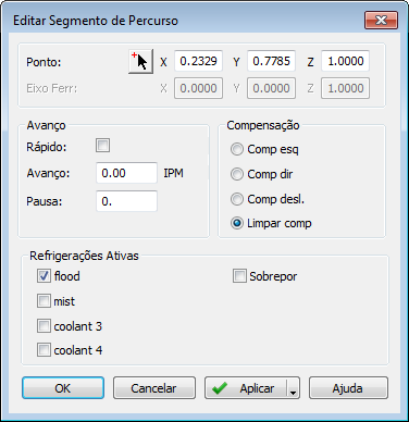 Para exibir o diálogo Editar Segmento de Percurso, selecione um segmento de percurso na guia Percursos do diálogo Propriedades da Figura de Fresamento e clique em Editar segmento