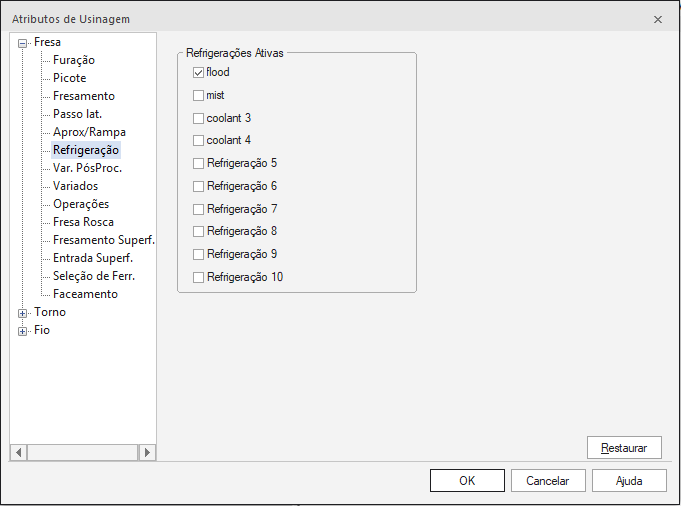 Selecione os tipos de refrigeração que você deseja utilizar. Os tipos de refrigeração disponíveis são especificados no arquivo CNC utilizando o diálogo Refrigeração no XBUILD.