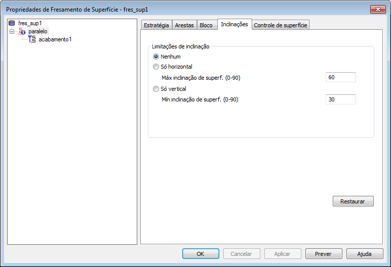 Você pode utilizar a guia Inclinações do diálogo Propriedades de Fresamento de Superfície para especificar as limitações de inclinação de um percurso de Fresamento de Superfície 3D.