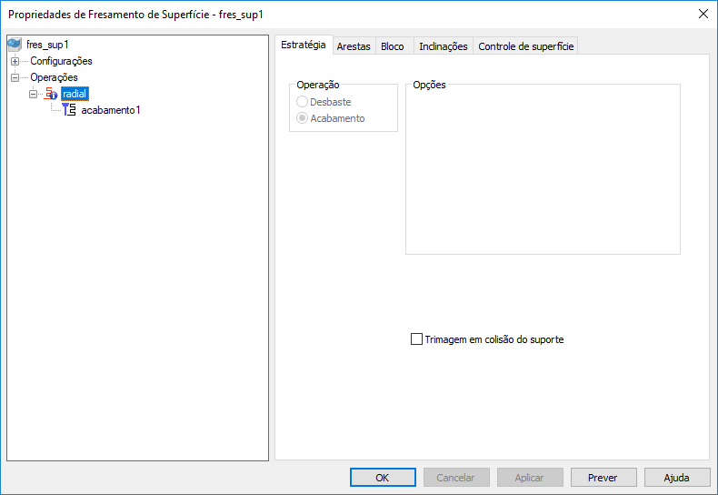Trimagem em colisão do suporte — Trima o percurso onde o suporte ou haste colide com uma superfície da peça, superfície de controle ou material não usinado. Quando selecionado, os atributos Folga de suporte e Folga da haste são exibidos na guia Fresamento para a operação.