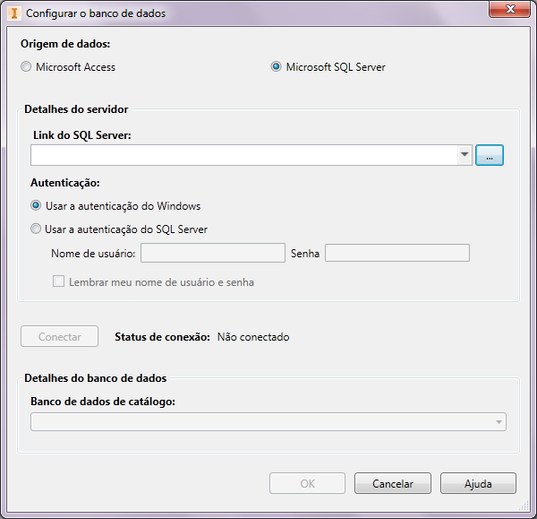 Especifique o tipo de banco de dados para a sua fonte de informações de catálogo.