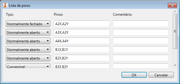 A lista de pinos é gravada no banco de dados no formato exigido pelo programa, por exemplo: 1,A1X,A1Y;2,A2X,A2Y;1,A3X,A3Y;1,A4X,A4Y;1,B1X,B1Y;1,B2X,B2Y;1,B3X,B3Y;1,B4X,B4Y.