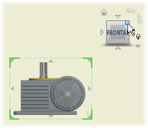 Quando você cria uma vista base, o ViewCube é exibido no canto superior direito da vista base. Clique em uma face, uma aresta ou um canto do ViewCube, ou clique nos manipuladores de rotação para definir a orientação desejada do modelo.