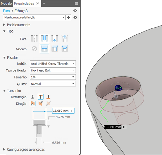 O novo comando Furo é mais rápido e inteligente, pois deduz o posicionamento dos furos com base em suas interações. É possível aplicar restrições concêntricas e de cotas sem precisar criar um esboço primeiro. Em seguida, é possível alternar entre a edição da operação e a edição do esboço sem sair do comando.