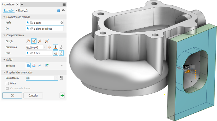 A partir do comando Medir no Inventor 2018 e do comando Furo no Inventor 2019, outros comandos foram atualizados com uma nova interface do usuário do painel de propriedades, que inclui aprimoramentos no fluxo de trabalho e na funcionalidade. O Inventor 2020 amplia a IU do painel de propriedades com os comandos Extrusão, Revolução, Varredura e Rosca para melhorar a funcionalidade e aumentar a produtividade.