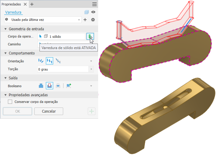 Além de um novo painel de propriedades para um fluxo de trabalho simplificado, a Varredura de sólido permite fazer a extrusão de percurso de um corpo da operação de sólido em um caminho. O exemplo a seguir mostra uma caminho de varredura fixo sem torção para simular a trajetória da ferramenta.