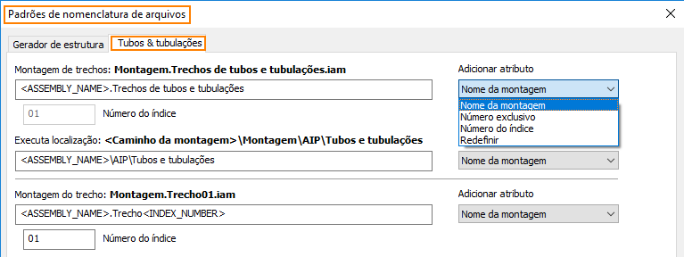 Padrões de denominação de arquivo inclui uma guia Tubos e tubulações, em que é possível especificar como criar arquivos e pastas. Por exemplo, você pode usar essas configurações para manter a estrutura de pastas plana e eliminar por completo o sub-diretório AIP. Além disso, já é possível configurar o esquema de denominação utilizando as opções na nova lista suspensa Adicionar atributo.