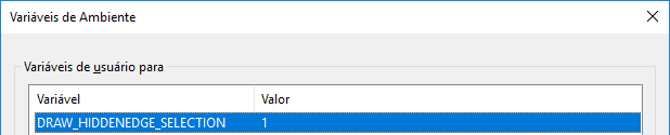 O comportamento padrão é não exibir linhas ocultas em um corpo selecionado. Para exibir linhas ocultas em um corpo selecionado, crie uma variável de ambiente chamada DRAW_HIDDENEDGE_SELECTION e defina um valor diferente de zero.