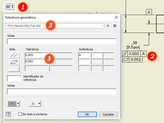 Dica: Para rotacionar o símbolo de tolerância geométrica, clique com o botão direito do mouse no símbolo e, em seguida, em Rotacionar 90º no SH ou no SAH.