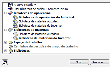 Bibliotecas de Materiais e Aparência são separadas de outras bibliotecas, como as Bibliotecas de Estilos, referenciados no projeto. Bibliotecas instaladas com produtos da Autodesk são de Somente Leitura. É possível definir suas bibliotecas personalizadas como Somente leitura ou de Leitura Gravação utilizando o atributo de arquivo.