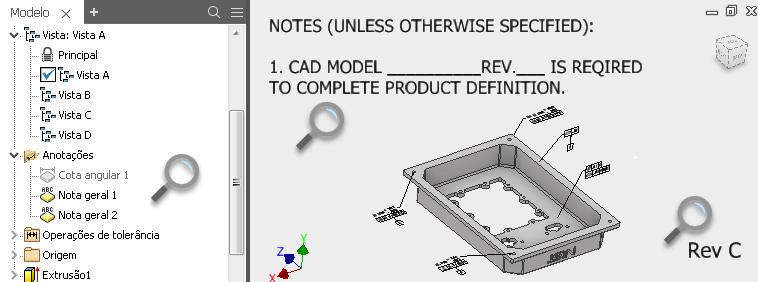 Dica: No Inventor, os nós que você adiciona ao modelo 3D não giram e são sempre normais para a vista ativa. O texto da nota no arquivo PDF exportado gira com a vista. Para obter melhores resultados, consulte a imagem a seguir como exemplo e faça o seguinte antes de exportar: