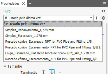 Para inserir furos com rapidez, use predefinições ou especifique as opções Cotas de furo, Ponto de furação, Terminação e Tipo de rosca usando o painel Propriedades.