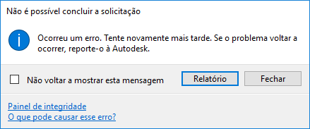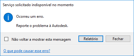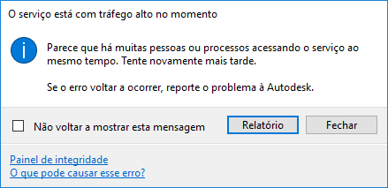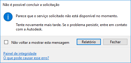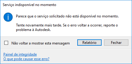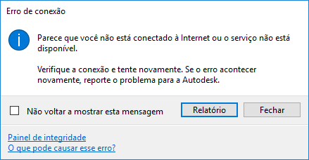 Se estiver conectado à Internet, mas continuar recebendo a mensagem, clique no link Health Dashboard e verifique o status do serviço. Se o Health Dashboard mostrar que o serviço está funcionando como esperado, mas você continuar recebendo a mensagem, reporte o problema ao suporte ao produto da Autodesk. |