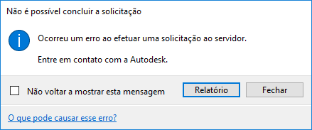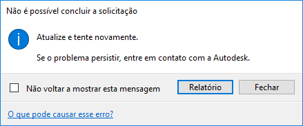 Ao trabalhar on-line, você pode receber uma mensagem de erro de HTTP. Essa mensagem é proveniente de um dos serviços da Web usados pela Autodesk e indica que algo deu errado. Na maioria dos casos, o problema está relacionado a um dos serviços da Web da Autodesk e, para ser resolvido, requer a ajuda do suporte ao produto. Esses tipos de erro precisam ser reportados ao suporte ao produto da Autodesk. Em alguns casos, você poderá tomar medidas para resolver o problema sozinho.