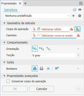 Importante: O comando Varredura usa um painel Propriedades para definir a operação. Se não estiver familiarizado com os painéis Propriedades do Inventor, consulte