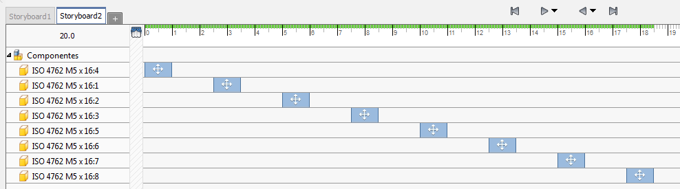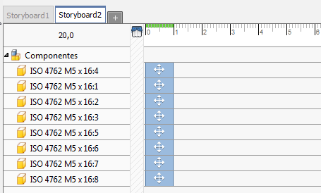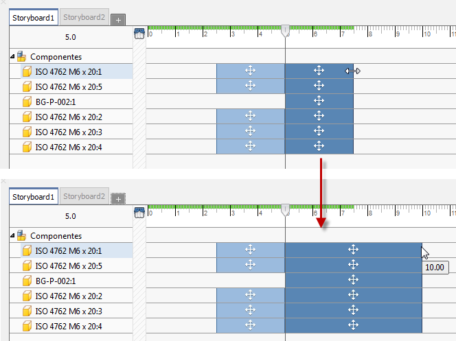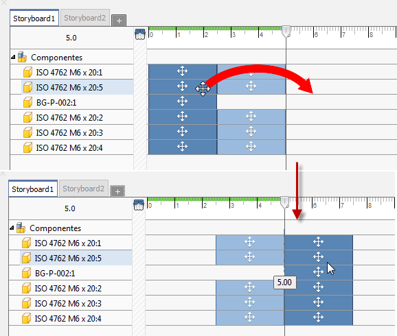 Mover: Para selecionar várias ações, pressione a tecla Ctrl e clique com o botão esquerdo do mouse; em seguida, arraste as ações selecionadas para outro local na linha de tempo. É possível arrastar as ações para uma posição antes ou depois de outros ajustes de posição. A movimentação de ações pode ser realizada com qualquer seleção de ações. Quando você arrasta ações com horas de início/término diferentes, o conjunto de seleção mantém as relações.
