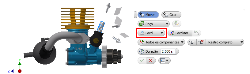 Agora, você pode especificar a direção do ajuste de posição usando o sistema de coordenadas local (componente) ou o sistema de coordenadas universal (apresentação) na minibarra de ferramentas. Em conjuntos de seleção múltipla, o sistema de coordenadas local é alinhado ao primeiro objeto selecionado.
