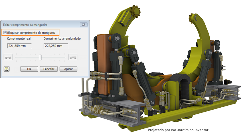 A nova opção, Bloquear comprimento da mangueira, permite calcular a soma exata do comprimento da mangueira. Se essa opção for selecionada e algum componente for movido, o comprimento da mangueira não será alterado devido à adaptabilidade.