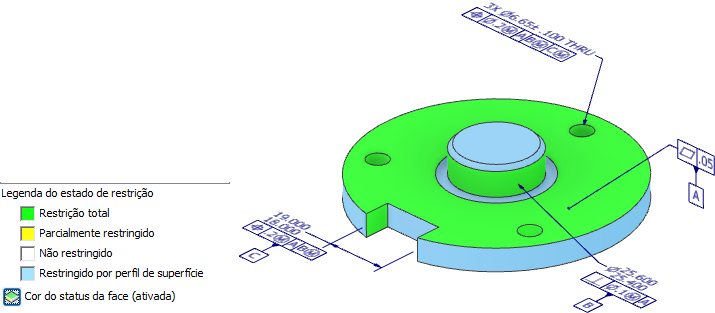 Agora o Tolerance Advisor exibe o estado de restrição usando um código de cores. Clique em Cor do status da face no Tolerance Advisor para ativar a exibição de cores.