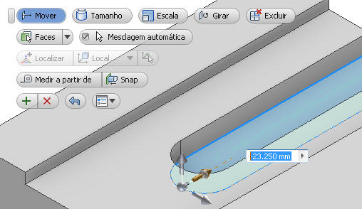 Edição direta, você só podia girar ou mover operações de face para outro local. Quando desmarcada, a opção Mesclagem automática mantém esse comportamento e move a face para outro local. No entanto, quando essa opção é selecionada, o comprimento total da operação de face é modificado.