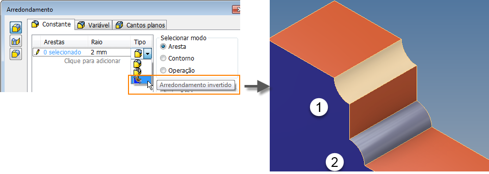 Essa nova opção de arredondamento é resultado de seu feedback. É possível criar arredondamentos com 1) arestas convexas ou 2) arestas côncavas.