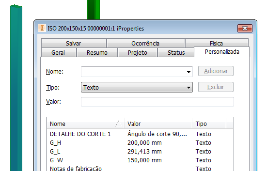 Os valores gerados após a execução do comando Aparar/Estender para recortar ângulos em membros da estrutura estão disponíveis em iProperties/guia Personalizado como CUTDETAIL1, CUTDETAIL2 etc. Esses valores podem ser incluídos na lista de materiais e na lista de peças. Além disso, o parâmetro G_L do Gerador de estrutura reporta os comprimentos corretos.