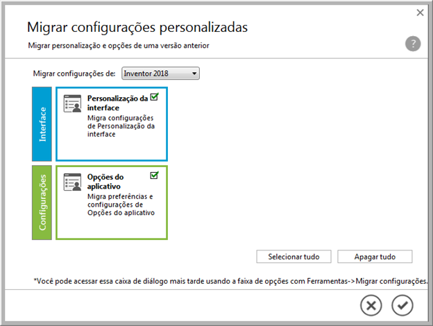 Use o recurso Migrar configurações personalizadas para transferir a personalização existente e as configurações de Opções do aplicativo para a versão mais recente do Inventor. Os administradores têm controle adicional sobre o uso dessa opção em implementações.